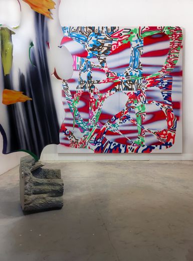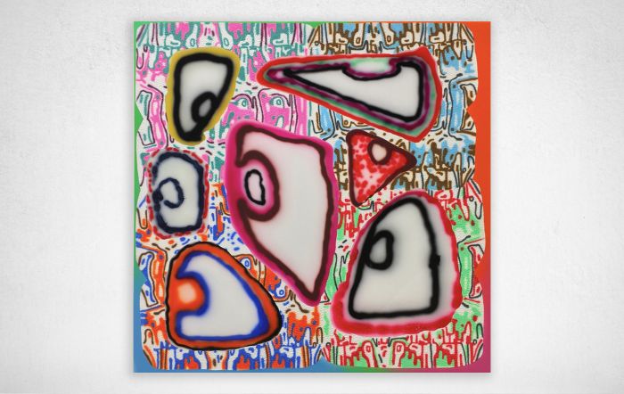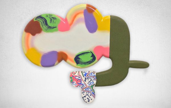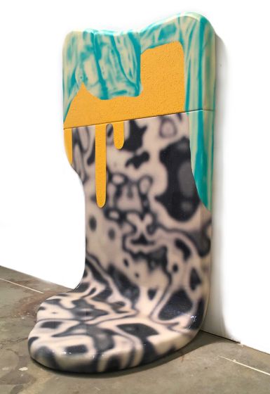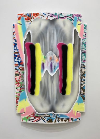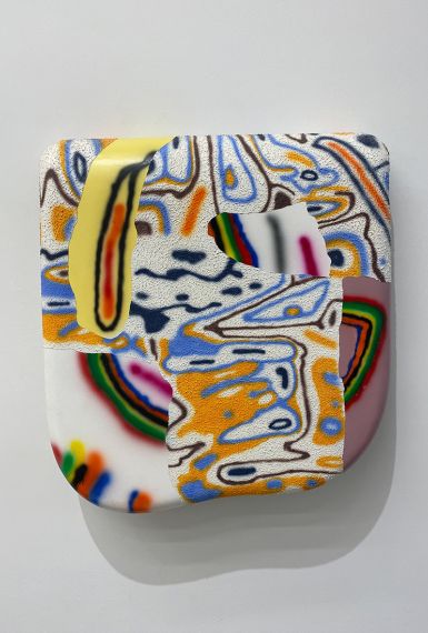 “The sheer enjoyment of searching for and being open to strange beauty is the foundation of what I do as an artist. The subconscious mind with all of its lexicon and image banks, Saturday morning cartoons, Disney classics, Tex Avery to Spongebob, and commercial art from the 1950s and 60s are all some of the things that inhabit my paintings. My process is more like doodling on peechee folders, combined with the collage of handmade decals, made of paint or paper, and sometimes covered in epoxy resins. These piles, this layering relates to my elaborate dense installation work of years prior. In this playpen of paint and what it can do, I discover things that are oddly new yet familiar, reinforcing the peculiar and interesting experience of being human.”